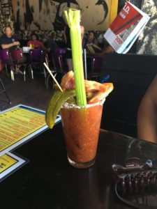 If you are reading this and not from Texas then you may not know what 6th Street in Austin is all about. 6th Street is a historic and entertainment 9 block area in the urban core of the city. The area is frequented by local college and university students and is popular for the many drinking establishments in the area. Scott and I were 6th Street virgins, but no more! We went on a weekday so it was not hopping, but that was ok with us. Casino El Camino is known for its Bloody Mary’s, of which I am a huge fan. They have an interesting heat scale from 1 to 8 with 6 being ghost pepper hot. I got a 4 and was very satisfied with the heat level. As you can see this drink is like a meal. This is a funky place playing B movies on the TV and mostly caters to the punk crowd.